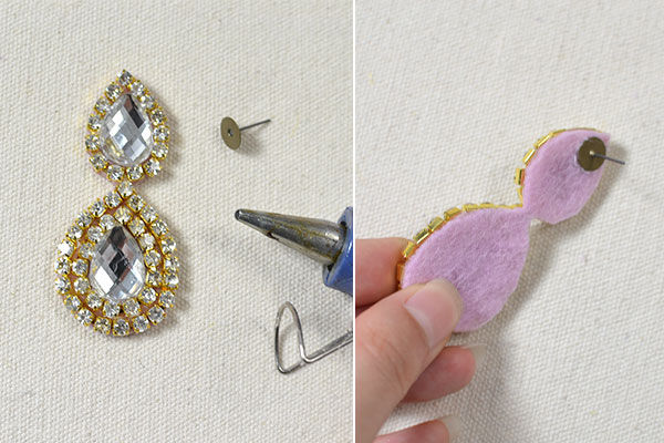 3. Еще один интересный вариант изготовления модных вечерних сережек. Понадобятся каплевидные стразы в цапах. Они закреплены на фетре при помощи иглы и ниток. В основании имеются специальные дырочки, к которым крепится стразовая лента. Крепление в мочке уха осуществляется при помощи застежки - гвоздика, которая прикреплена при помощи клеевого пистолета.