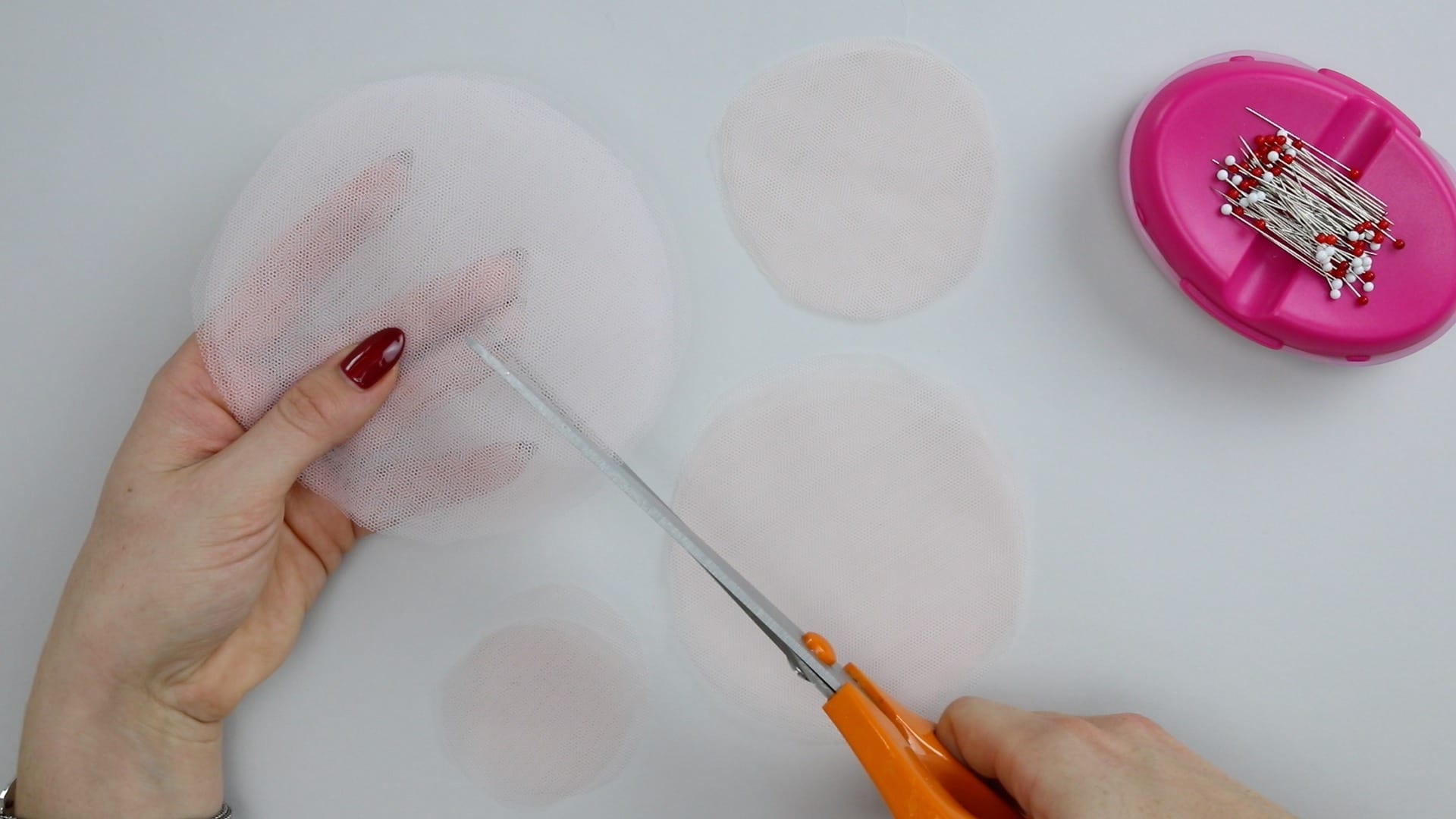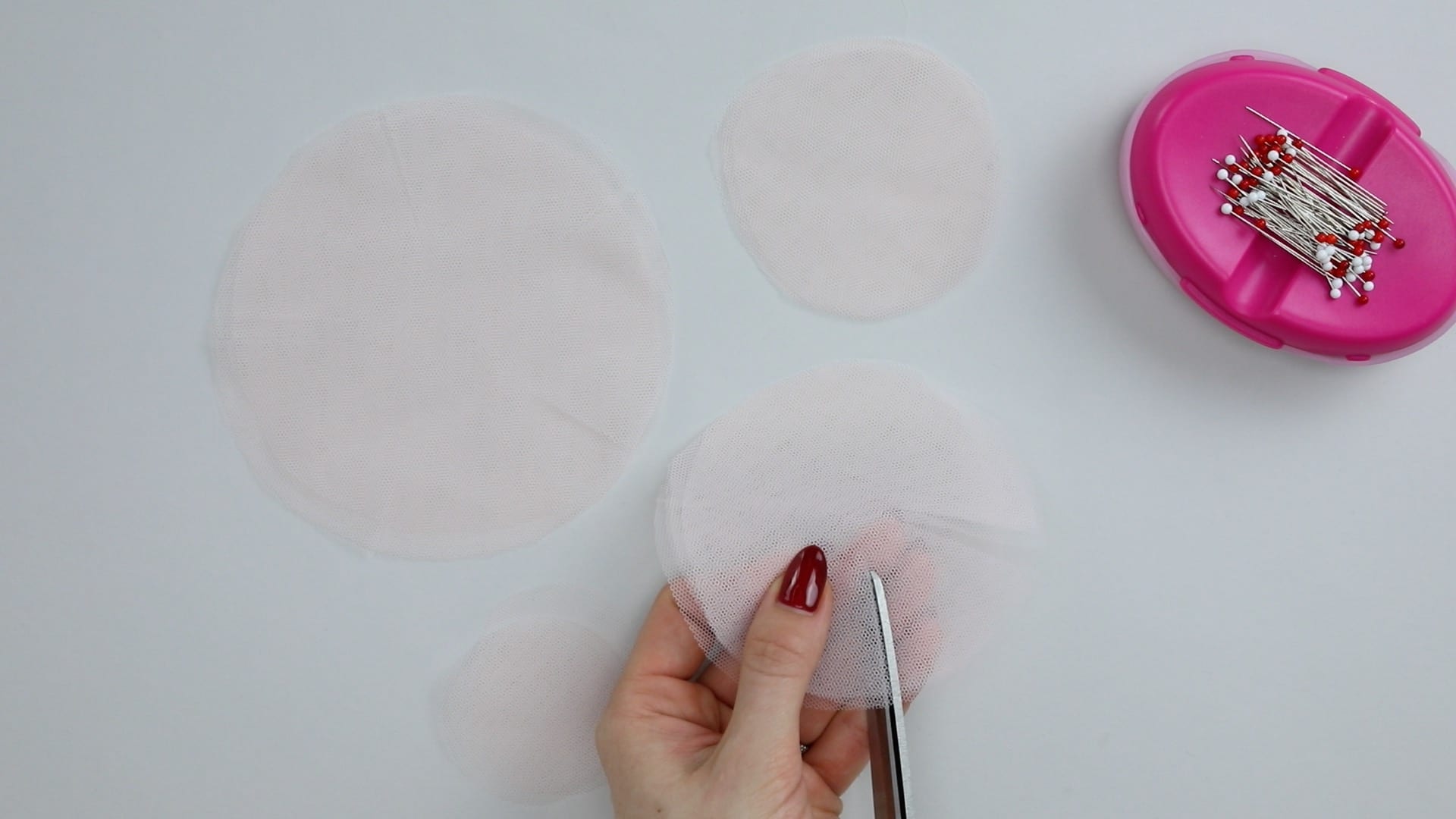 2. Обведите шаблоны необходимых размеров на ткани по вашему выбору. Мы сделали шаблоны диаметром 7,5, 10 и 12 см. Вырежьте из ткани круги по разметке.