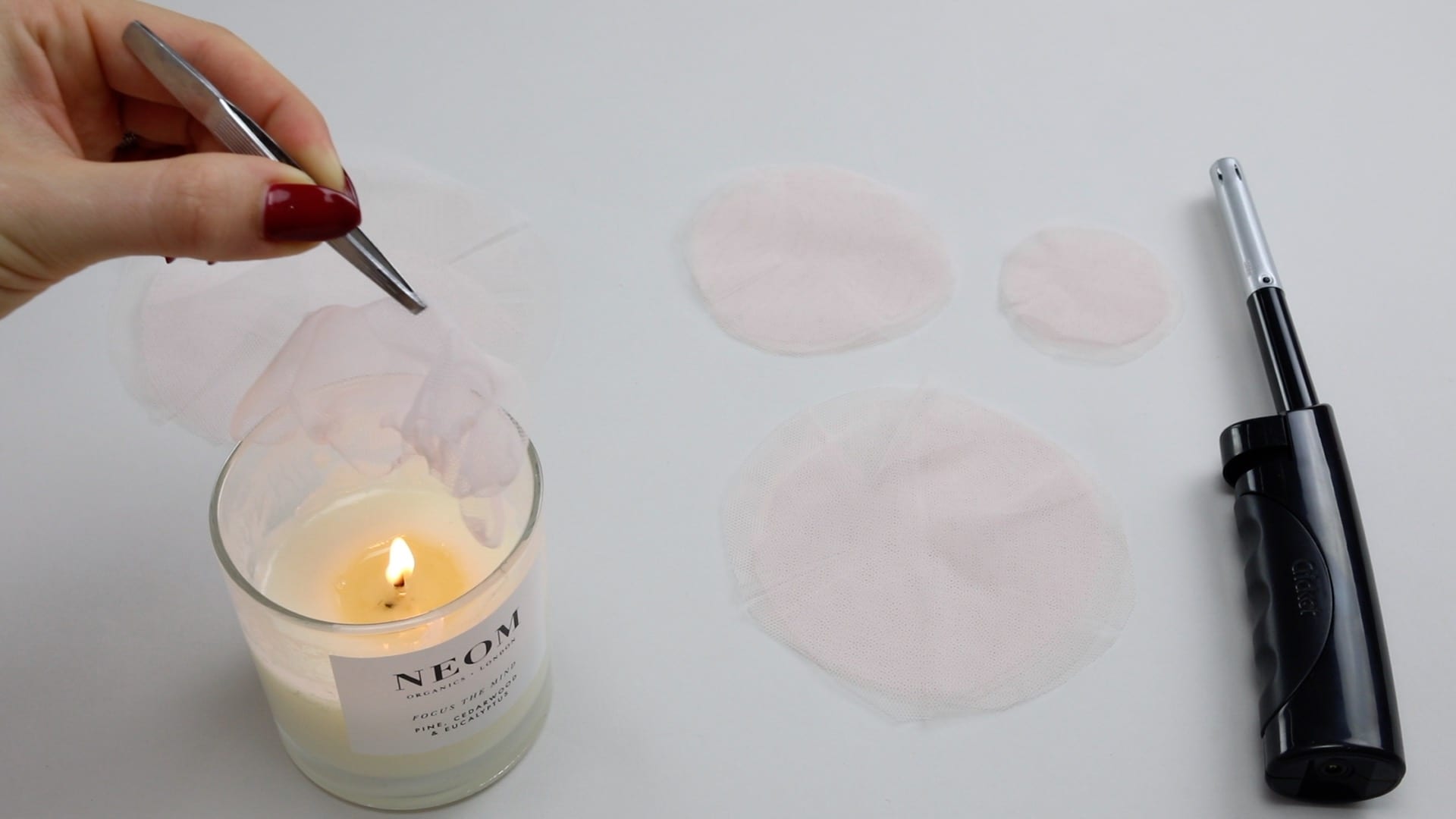 4. Зажгите свечу и медленно подносите края будущих лепестков к пламени, чтобы края ткани начинали плавиться, но ни в коем случае не загорались. Фатин должен сворачиваться и создавать формы, похожие на лепестки настоящих цветков, как, например, у пионов. Используйте пинцет или щипцы, чтобы крепче и безопаснее удерживать ткань. Проделайте оплавку краев на всех кругах из ткани.