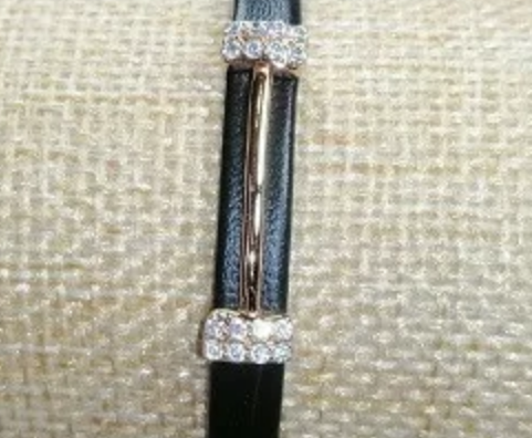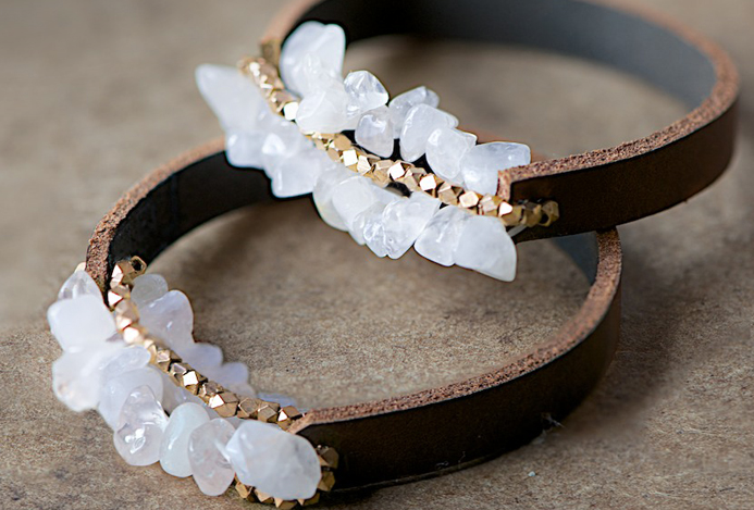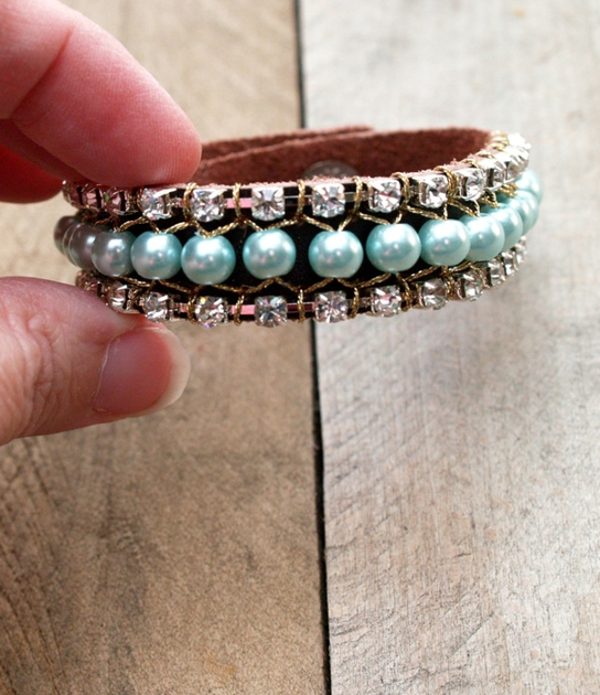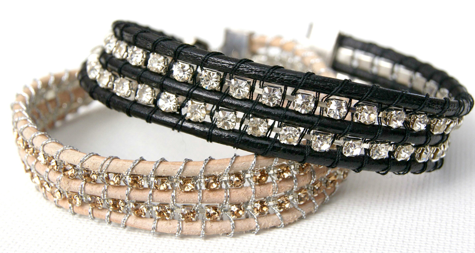 4. Разделители со стразами смотрятся не менее оригинально в содружестве с кожаными шнурками. 3-4 штуки вполне достаточно, чтобы браслет стал стильным и сверкающим.