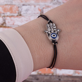 7. Такой мощный оберег могут носить даже мужчины. В работе мастерица использовала декор в виде ладони с глазом. В древневосточной мифологии именуется как «Яд ха-хамеш» или рука Мириам. Служит защитой от сглаза. Ладонь и кожаные шнуры можно приобрести в интернет-магазине, не выходя из дома.