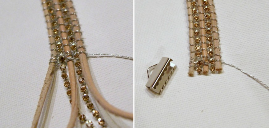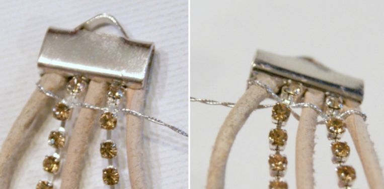 2. В концевике закрепить все, что потребуется для дальнейшей работы. Это три шнурка, две цепочки из стразов и нить. На внутреннюю поверхность нанести небольшое количество клея, затем закрепить все детали при помощи круглогубцев или плоскогубцев.