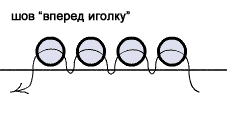 В этом способе можно произвольно регулировать промежутки между бисеринками, и в зависимости от них, результат может напоминать вышивку швом «Вперед иголку» либо же швом вприкреп. Когда вышивку нужно сделать более жесткой или закрепить бусинки на прямой/плавной извилистой линии, по завершении стежка иголку протягивают через пришитые бисеринки в противоположном направлении, от чего они «становятся» ровно.