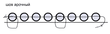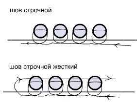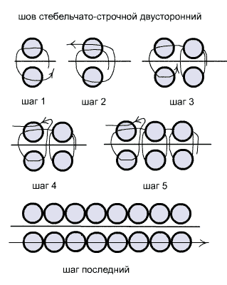 Такое шитье получается из комбинации двух описанных выше стежков: строчного со стебельчатым. В результате получается довольно-таки жесткая вышивка. Техника его выполнения отображена на рисунке: