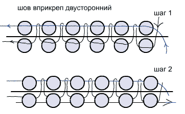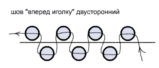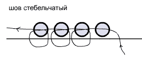 Применяя этот шов получают достаточно жесткую вышивку. Выполняется он так: набирается 2 бусинки, иголка проводится сквозь полотно на изнанку сторону рядом со второй бусинкой. Потом иголка выходит на лицо между этими бусинами, проходя через отверстие второй бисерины. Далее нанизывается третья бусина и иголка опять выходит на изнанку рядом с только что добавленной бисеринкой. Вышивание по этой схеме продолжается, пока не получают нужную длину строчки на ткани.
