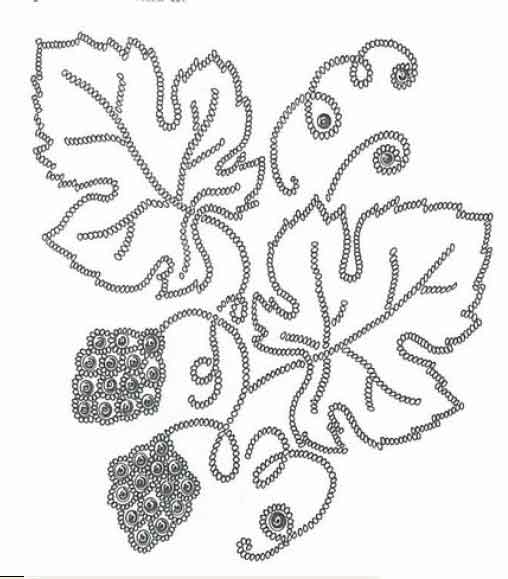 Особенности: сначала нужно вышить бисером под цвет ткани листки и веточки. Затем пришить бусинки для «шишек», обшив их после контуром из бисера. При вышивке «усиков» с извилистыми линиями лучше использовать «арочный шов».