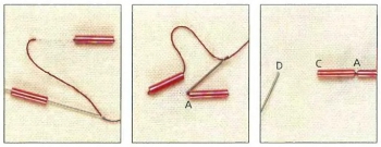 6. Нить затягивается и выходит на лицевую часть в точке D. Промежуток между точками D и С составляет длину одного стекляруса.