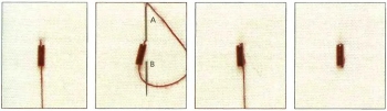 2. Затем иголка выходит на изнаночную часть, в точке А. потом игла снова возвращается на лицевую поверхность, в точке В, через петлю. (промежуток между точками А и В составляет длину одного цилиндрика).